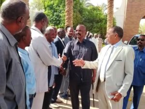 العاملون بحكومة الولاية الشمالية يستقبلون والي الشمالية لواء ركن (م) عبد الرحمن عبد الحميد بمقر أمانة الحكومة .توطئة لمباشرة مهامه بصورة رسمية