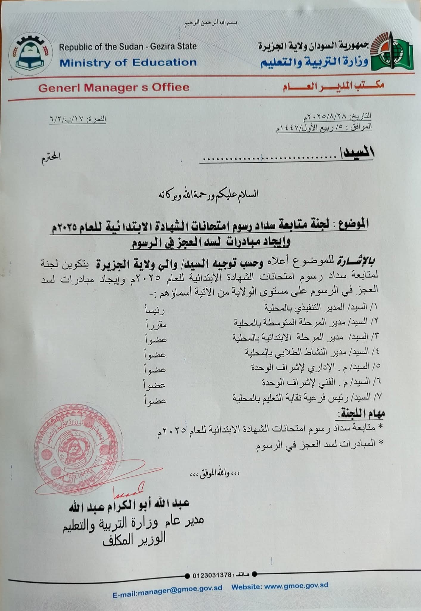 اصدر الاستاذ عبدالله أبوالكرام عبدالله وزير التربيه والتعليم ولاية الجزيرة وبناء علي توجيهات والي ولاية الجزيره قراراً بتكوين لجنة لمتابعة سداد رسوم امتحانات الشهادة الابتدائيه للعام 2025م وإيجاد مبادرات لسد العجز في الرسوم برئاسة المدراء التنفيذيين بالمحليات .واوضح الاستاذ عبدالله أبوالكرام أهمية تكافل كافة قطاعات المجتمع والمنظمات لمساعدة الشرائح الضعيفه والتي تأثرت بسبب الحرب مشيراً أن هذا العام يمر بتحديات تتطلب تضافر الجهود الرسميه والشعبيه للارتقاء بالعمليه التعليميه وصولاً للغايات والاهداف المنشوده.